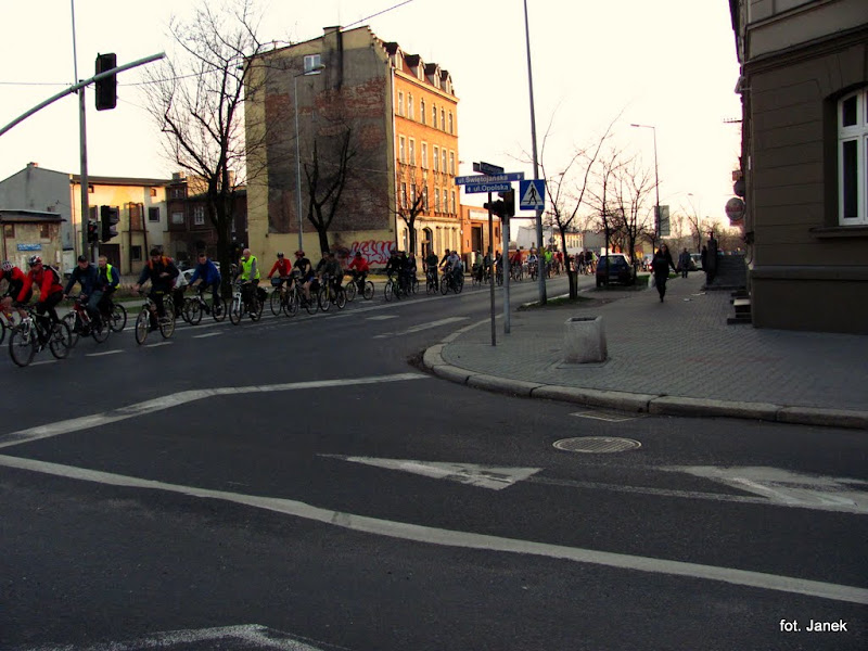 Wczoraj wiosna dała "czadu" w pełni pogodowej okazałości. Dziś niestety już tylko połowa tego, co wczoraj wskazywały termometry, za to wiatr jak w przysłowiowym Kieleckim wiał. Choć dzień wcześniej straciłem niemal zupełnie głos, postanowiłem jednak, że nie odpuszczę sobie ani jednej Masy w swoim mieście. Tą myślą zmobilizowany udałem się w dwuosobową trasę do Kubusha, a później już w trójkę na pl. Wolności. Ludzie szybko się zbierali, dość wcześnie przyjechała silna reprezentacja z Katowic, chwilę później dołączyły i Gliwice. Nim się obejrzałem, a już trzeba było jechać, a na placu czekało na to ponad sporo ponad oczekiwania rowerzystów.
